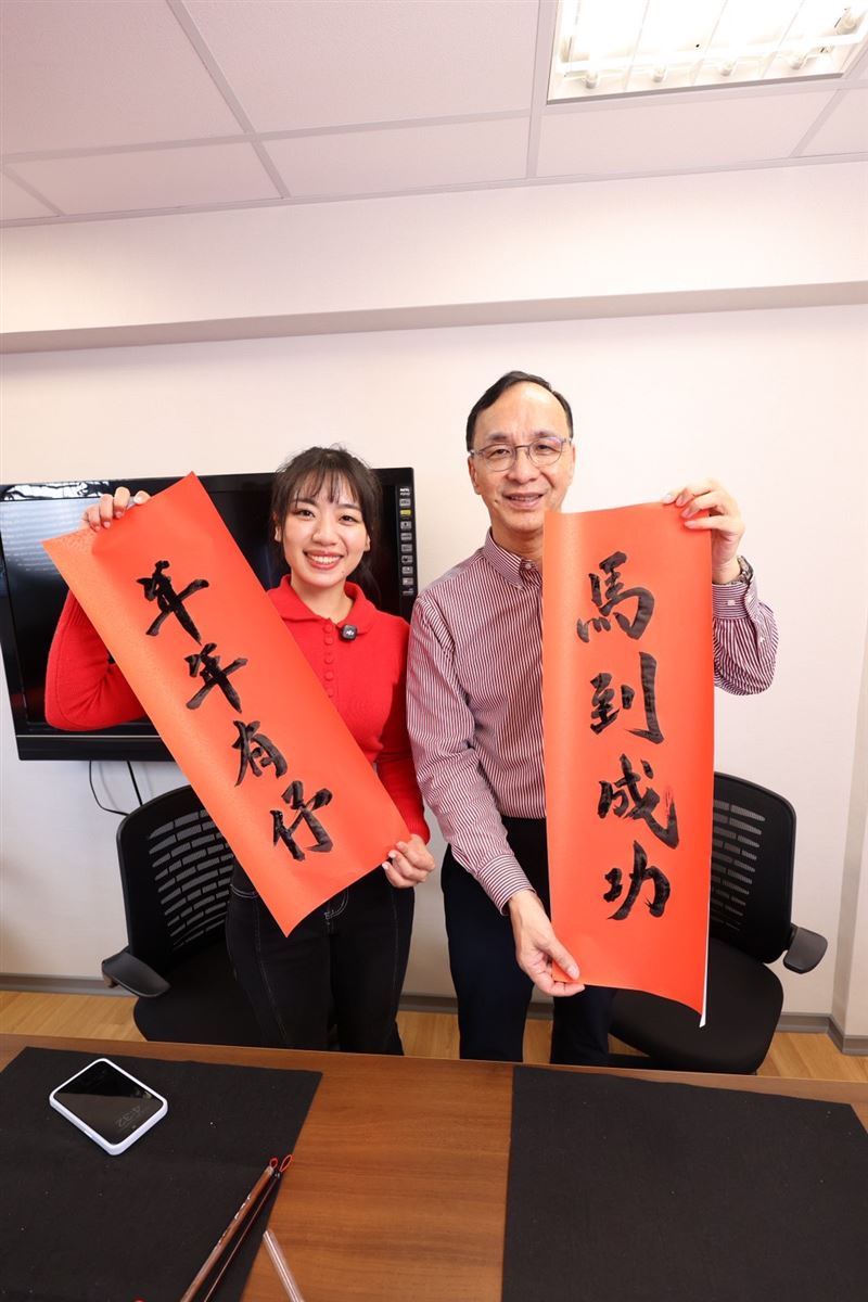 最後,朱立倫再挑戰高難度對聯,寫下「智韜經略開太平,馬到成功展新生」,寓意期許國家大政都能以智慧、宏觀的眼光與佈局來治理,使社會能享有平安、祥和的新年,也祝福國人在馬年都能夠馬到成功、展開新局,新年快樂。