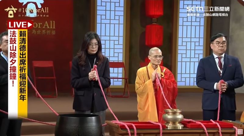 新北市金山法鼓山昨(16)日晚間舉辦「除夕撞鐘‧為世界祈福活動」,國民黨主席鄭麗文出席參與,並與方丈和尚果暉法師等人共同敲響第106至108響法華鐘。但鄭麗文手握紅繩時,突然抖了一下,畫面引發討論。