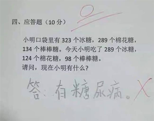 從數學考卷上看到,題目寫著「小明口袋裡有323個冰糖、289個棉花糖、134個棒棒糖。今天小明吃了289個冰糖、124個棉花糖、98個棒棒糖。請問,現在小明有什麼?」老師出題原意應是希望學生展現加減法的運算能力,算出剩餘糖果的總數。