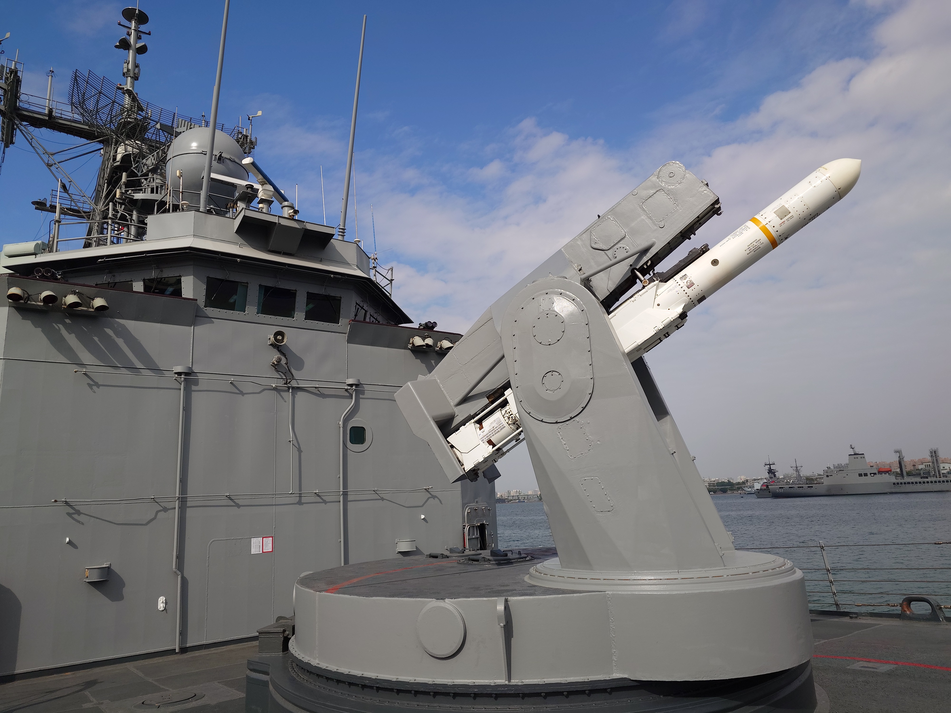 海軍派里級逢甲軍艦展示其配備的魚叉飛彈,這也是Mk.13發射架掛載魚叉飛彈在國內首度展示。 記者徐宇威/攝影