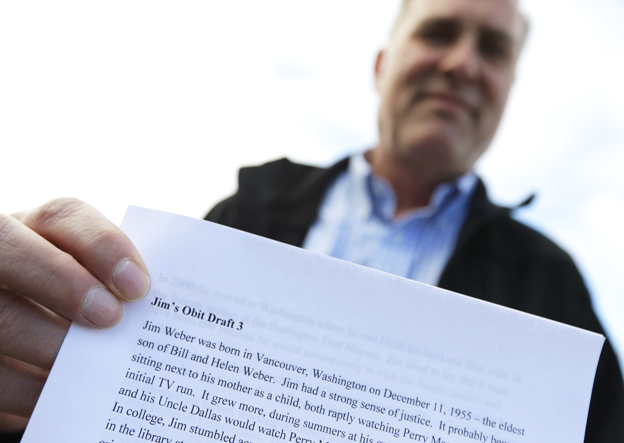 醫療和房租最先衝擊退休的高齡者,尤其自掏腰包醫療費用超乎想像。圖為住在華盛頓州的韋伯出示自己寫的訃聞。(美聯社)