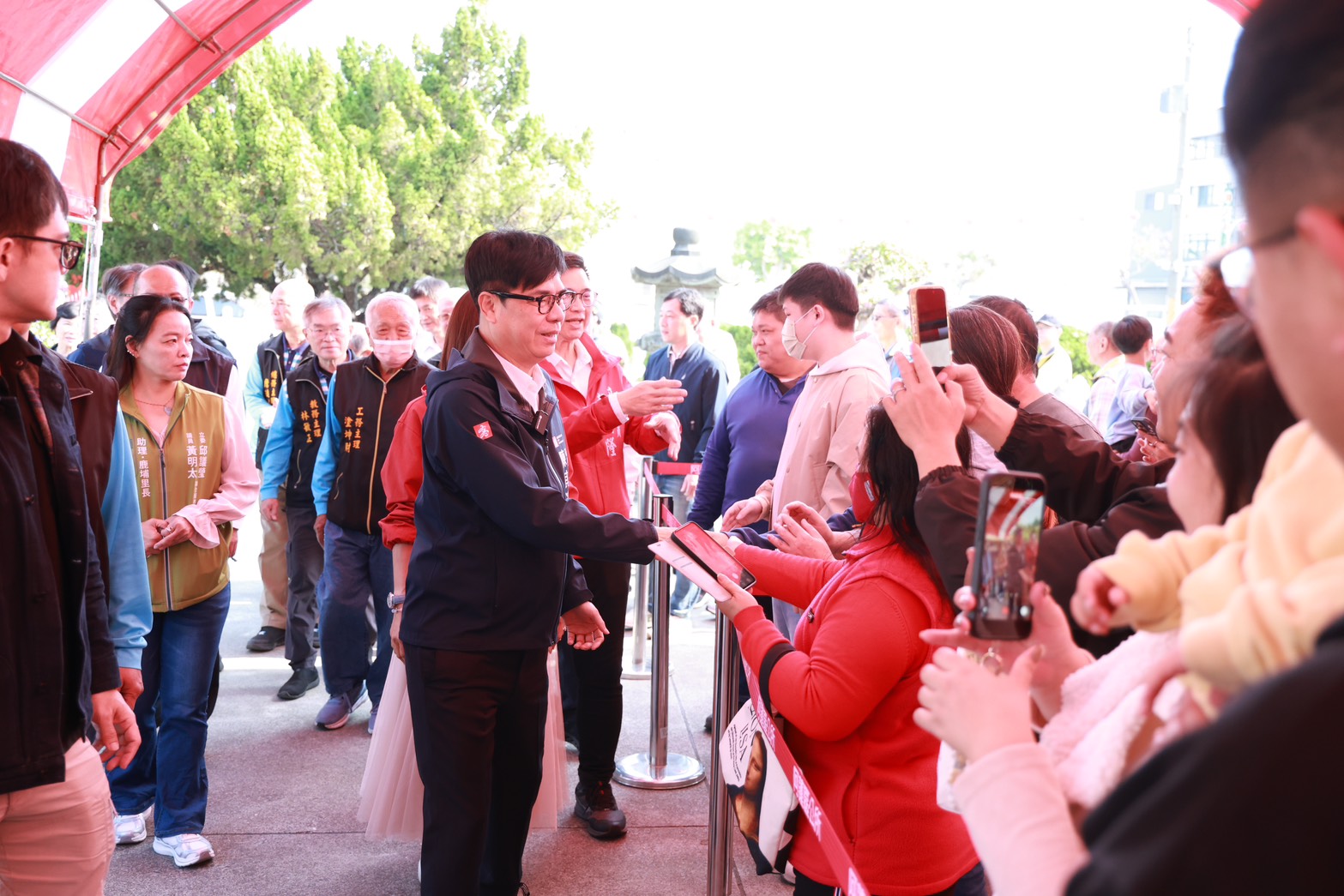 陳其邁說,希望持續的推動城市轉型、極端氣候的挑戰影響高雄愈來愈明顯,希望國泰民安、風調雨順,不要有颱風進來,雨能夠平均下的更多一點點,讓農民都能夠收穫滿滿。