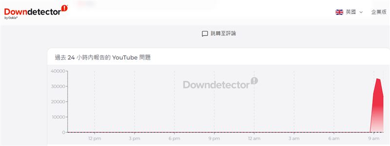 根據網路監測網站《Downdetecto》r的即時數據顯示,今(18)日上午9時起,YouTube的異常通報數量明顯飆升,短短一小時內即突破1200件,顯示平台疑似出現大規模故障。通報地區以台北市、新北市、桃園市、台中市、彰化縣、雲林縣、台南市、高雄市及宜蘭縣為主。
