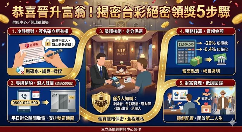 為了防範得主因驟獲鉅款而揮霍致貧,現場將有專業團隊提供定存、儲蓄險等穩健資產配置建議。多數台灣得主在享受財富之餘,也會選擇提撥部分獎金捐助弱勢或回饋開出大獎的彩券行。當手續在1至2小時內完成後,這位「準億萬富翁」便能低調地重返大眾視野,以最平凡的身影開啟不凡的第二人生。