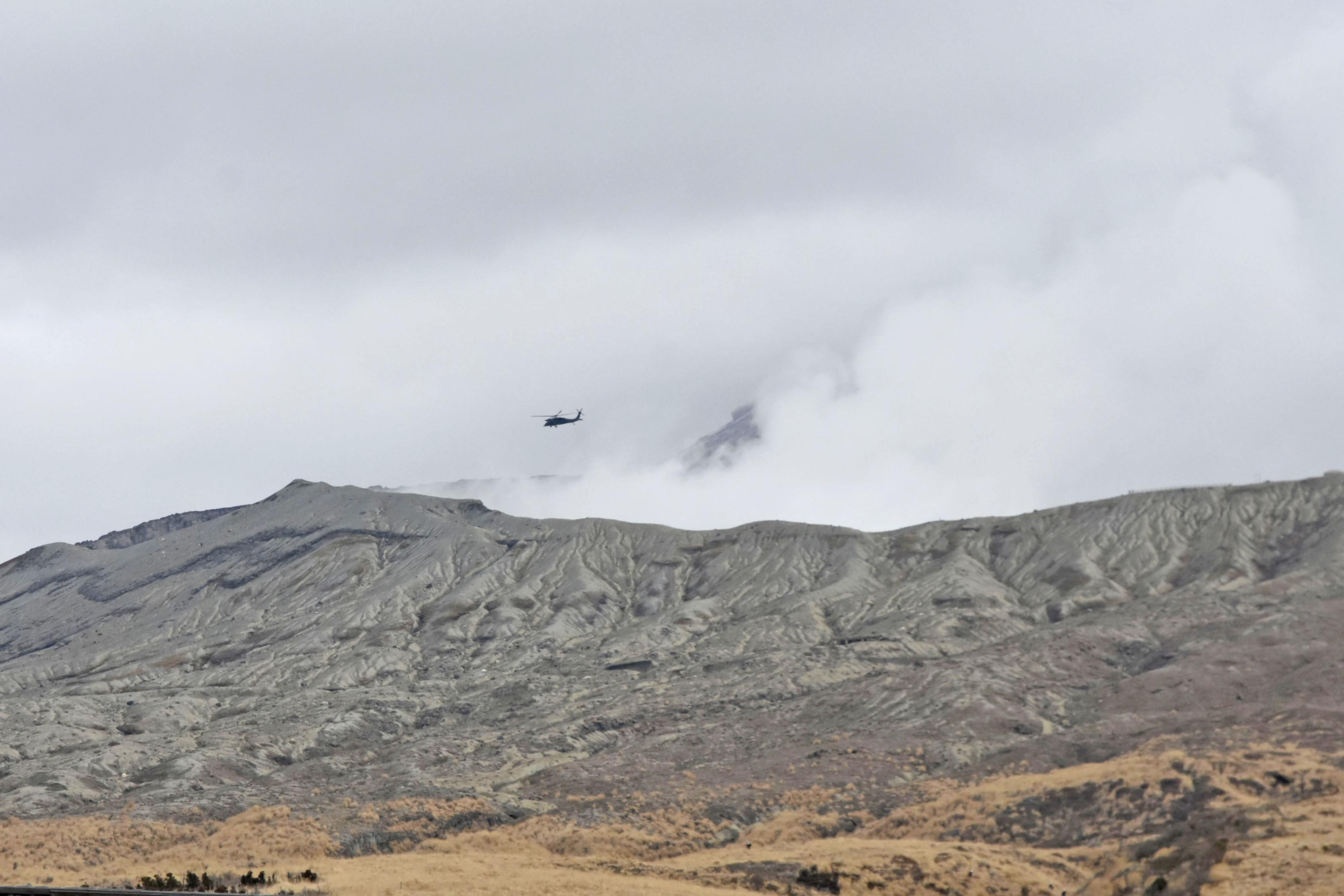 日本熊本縣阿蘇山1月20日發生觀光直升機墜毀事故,當地消防單位18日表示,已確認疑似為機上3人的身影,並指出生還的可能性極低。圖為阿蘇中岳火山口附近。美聯社