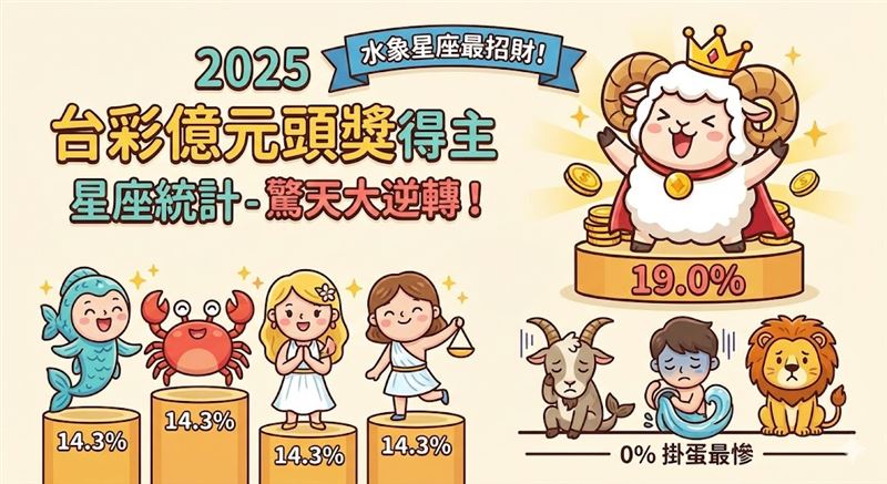 想當億萬富翁,難道真的要看命?台灣彩券(台彩)最新公布「2025 年億元頭獎得主星座統計」,結果令人玩味!過去的常勝軍慘遭滑鐵盧,牡羊座則是以黑馬之姿,狂掃 19.0% 占比勇奪年度冠軍,氣勢旺到擋不住;但幾家歡樂幾家愁,有3個星座今年竟然「全軍覆沒」,連一個億元得主都沒出現,讓網友直呼:「真的是命嗎?」