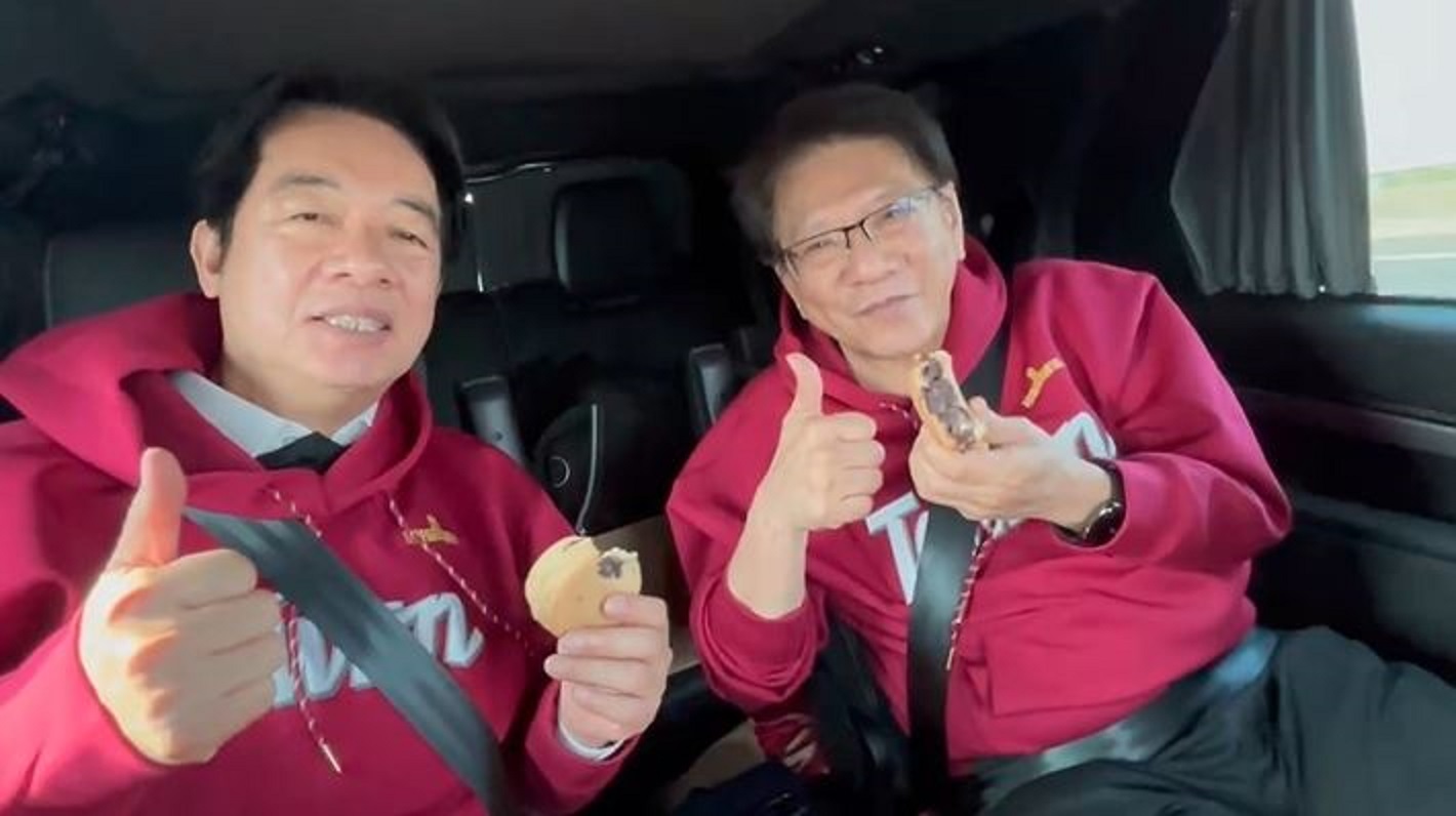 賴清德(左)與潘孟安在車上大啖屏東鄉親致贈的紅豆餅,頻頻說讚。圖/總統府秘書長辦公室提供