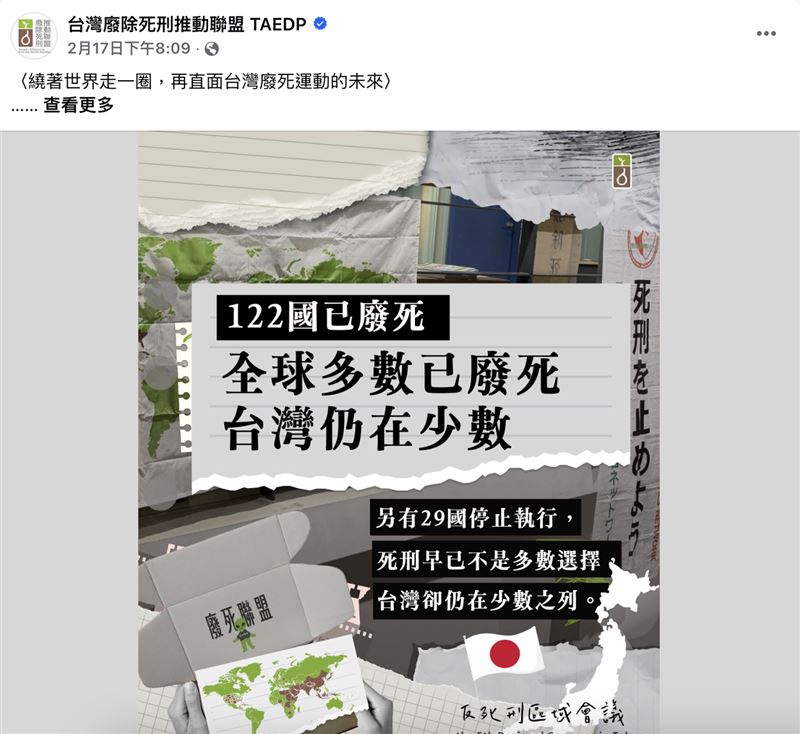 從新北國中生割頸命案到馬來西亞女大生命案、屏東刺青店縱火2死案、新北派出所長遭女毒蟲駕車拖行致死案,近月多起命案兇嫌逃死再度引爆社會輿論對於廢死與否的爭議。台灣廢除死刑推動聯盟(TAEDP)執行長林欣怡17日在粉專以「繞著世界走一圈,再直面台灣廢死運動的未來」為題發文,附上「112國已廢死,全球多數已廢死,台灣仍在少數」的照片,論述「台灣廢死運動要往哪裡去?或許答案不只在台灣,也在我們如何理解自己在世界中的位置。」