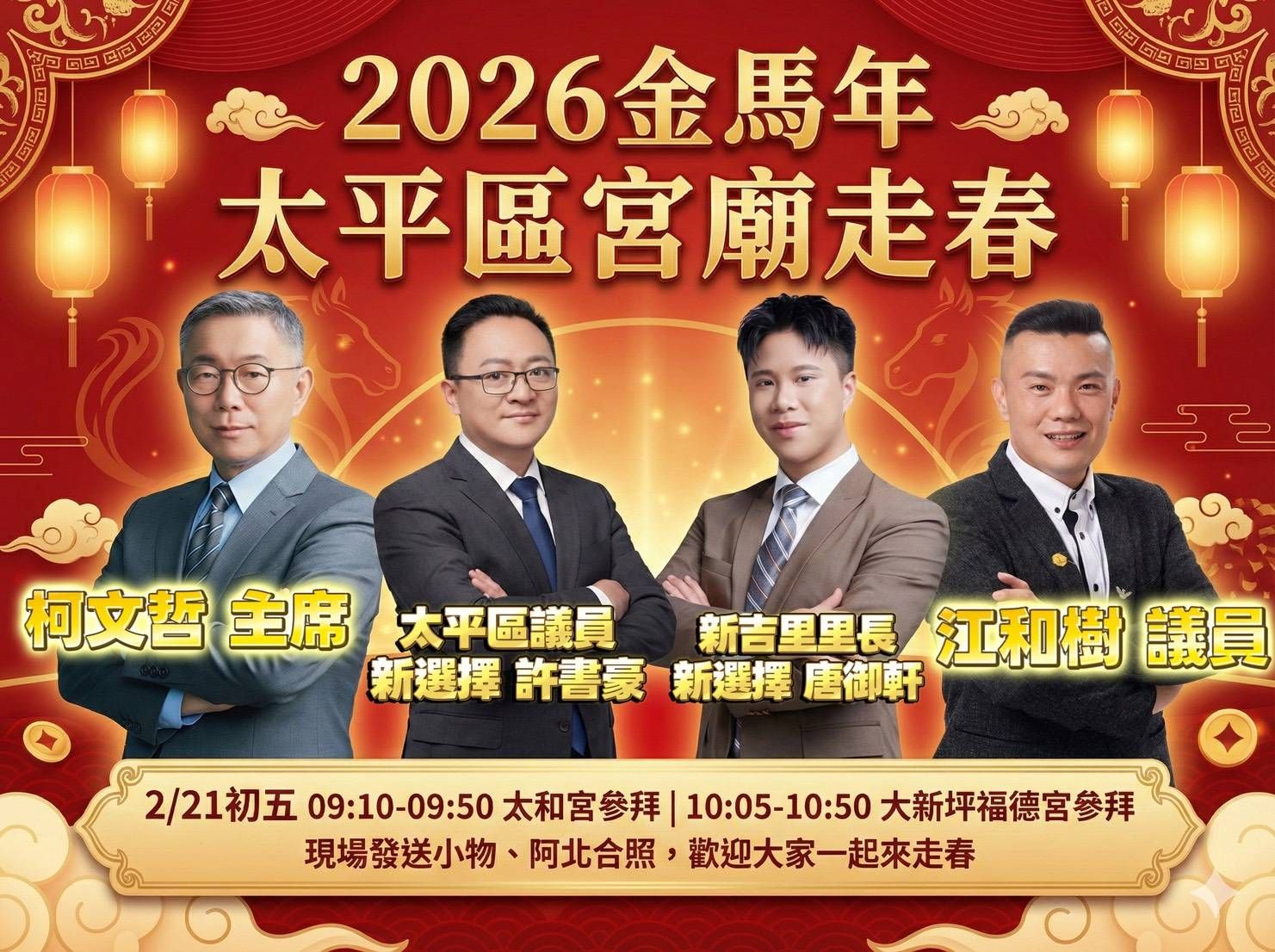 民眾黨台中市議員江和樹今公布,決戰中台灣,民眾黨前主席柯文哲「2026金馬年太平區宮廟走春」,大年初五(明天)上午9時10分,將赴太平太和宮參拜,10時5分赴大新坪福德宮參拜,包括江和樹、 市議員參選人許書豪、新吉里長參選人唐御軒等人陪同,現場發送小物,可與阿北合照,歡迎鄉親一起來走春。