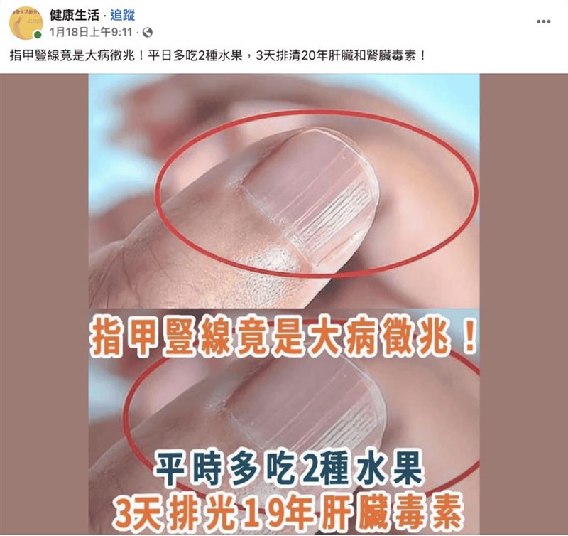 看到自己的指甲甲面出現一條條的豎紋,是否會猜想是身體哪裡出了問題?網路上流傳「指甲豎線竟是大病癥兆」文章,宣稱多吃2種水果3天就可清除肝臟和腎臟毒素。不過對此,皮膚科醫師表示,豎紋僅是老化現象,事實查核中心也發現,文章提供的連結沒有可信來源,又是不明網站、看不出來撰稿者,應是內容農場,民眾有疑慮應該還是循正常管道向醫師諮詢。