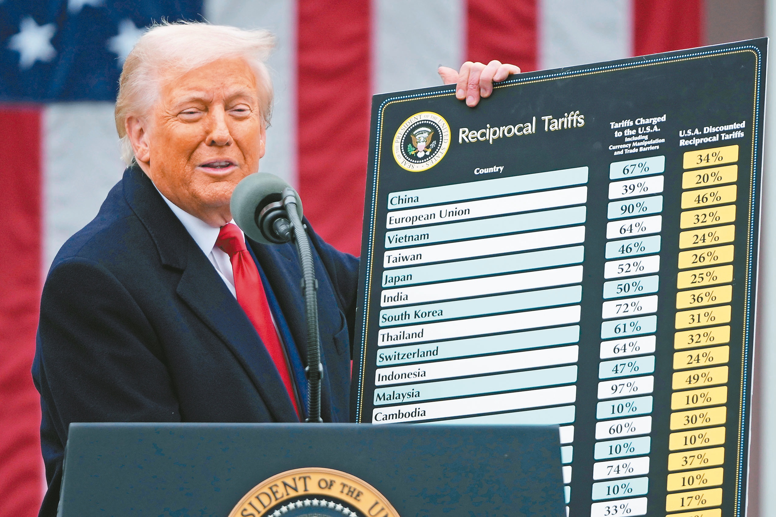 美國總統川普去年4月在白宮宣布對各國課徵對等關稅。美國最高法院20日判決,川普不得援引「國際緊急經濟權力法」課徵對等關稅,裁定這項關稅違法。(美聯社)