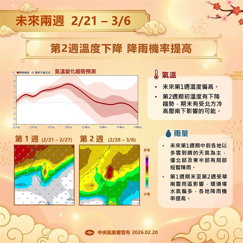 值得注意的是,氣象署分析,第1週期末至第2週(2/28~3/6),受到華南雲雨區影響,環境場水氣偏多,各地降雨機率提高,第2週期末北方冷高壓有南下可能,各地氣溫下降。