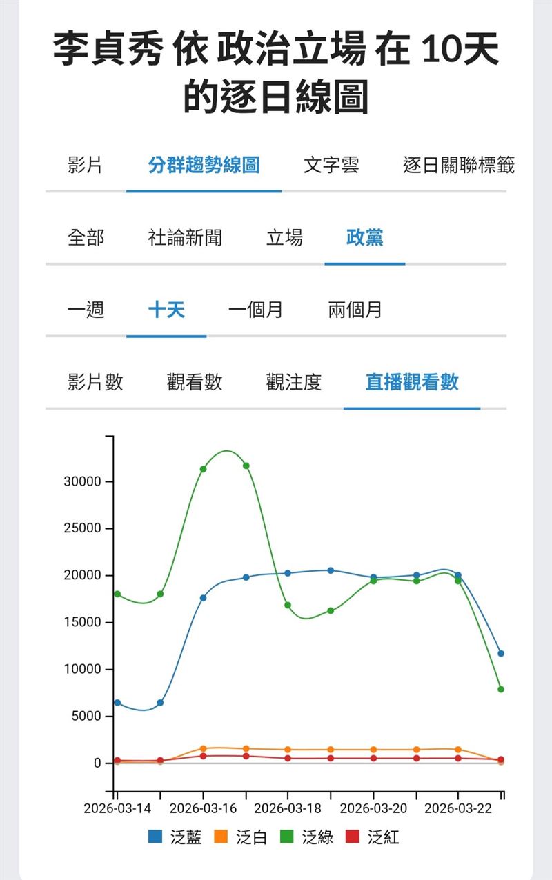 從近十日的YT直播聲量趨勢圖來看,李貞秀的聲量結構,是建立在極端對立之上。她靠著資格爭議、程序衝突、國台辦護航、兩岸敏感語言這些元素,一步一步把自己推成一個所有人都不得不看的政治秀。