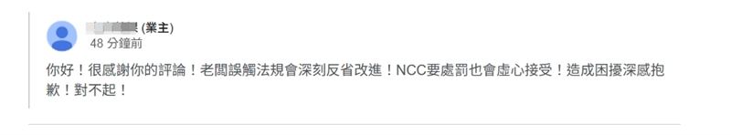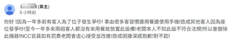 風波延燒一天後,也有民眾到店家Google留下負評。對此,業者坦承確實放置「訊號遮蔽設備」,並表示過去曾因座位訊號問題引發顧客爭執,才決定裝設。面對事件引發爭議,業者致歉表示,「老闆誤觸法規,會檢討改進,若NCC要處罰也會虛心接受,造成大家困擾深感抱歉。」原PO也將業者道歉內容補充於貼文中,並指出發文用意在於提醒與導正社會風氣,盼業者多加注意,「希望台灣可以善的循環」。