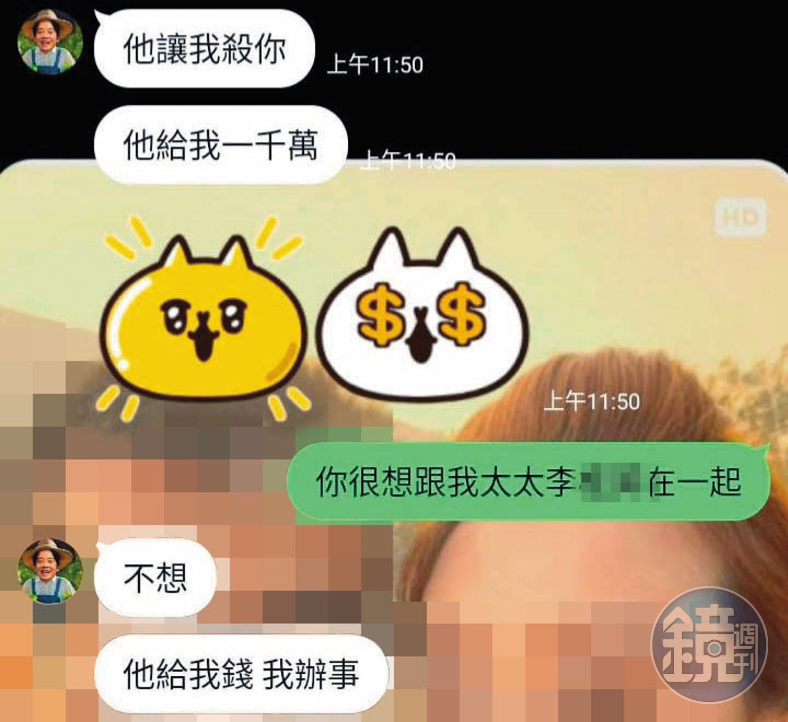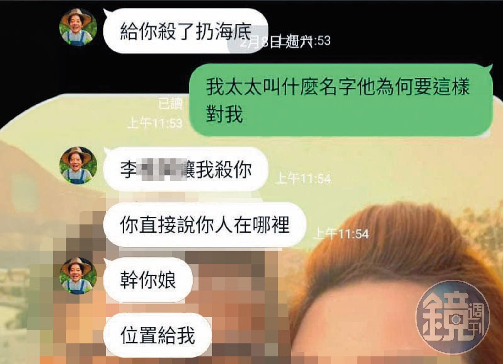 再次被戴綠帽的許男十分生氣,他質問太太,但李女僅要他顧好選舉,之後就避不見面,接著便開始有幫派背景的男子傳訊息給許:「你老婆給我1千萬元,讓我殺了你!」甚至還傳來槍枝照片,讓他恐懼不已。