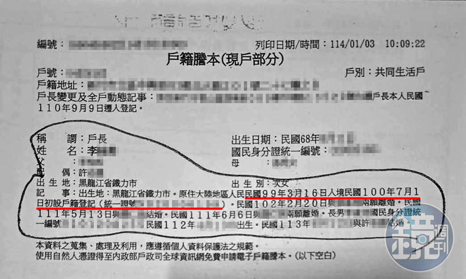 許男越想越覺得怪,趕緊檢視太太的資料,果然發現其中有鬼。他秀出李女的戶籍資料說:「我太太明明2010年才入境來台,卻在2013年跟第二任老公離婚以後,立刻換發身分證,這跟一般中國人士來台七年才能領身分證的規定也差太多了吧!」另外,許也從太太的手機錄音檔中,發現她跟四海幫走得很近,因為她曾豪氣地向某人表示:「四海幫欠我人情!」