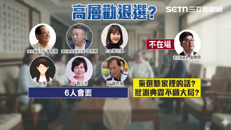 據了解,當天在場人員包括藍營高層,國民黨副主席李乾龍、國民黨組發會主委李哲華、謝家則有立委謝衣鳳及助理、媽媽鄭汝芬、爸爸謝新隆,一共6人會面,彰化縣議長謝典霖並不在場。