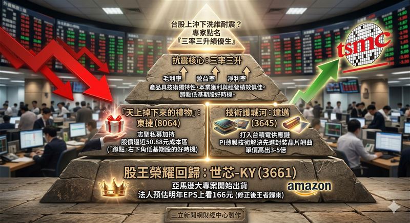面對大盤恐慌性補跌,陳威良建議投資人應鎖定「三率三升」的標的,即毛利率、營益率、淨利率同步上揚的模範生。他強調,這類公司代表產品具技術獨特性,且本業獲利與經營績效俱佳。特別是近期因系統性風險導致好公司被誤殺,反而是投資人「蹲點」右下角低基期股的好時機。他特別點名「東捷(8064)」,在志聖私募加持下,若股價逼近50.88元的成本區,簡直是「天上掉下來的禮物」。