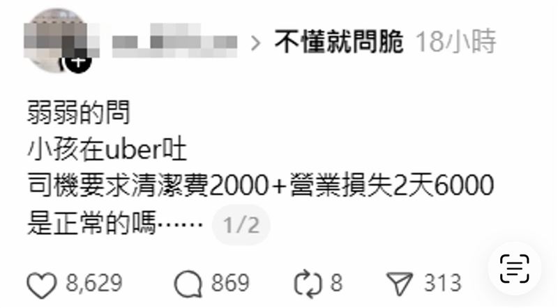 該名網友在Threads發文表示,小孩在Uber吐了之後,司機向他們要求「清潔費2千元」,加上2天的「營業損失6千元」,一共8千元,她不解地問「這是正常的嗎…」
