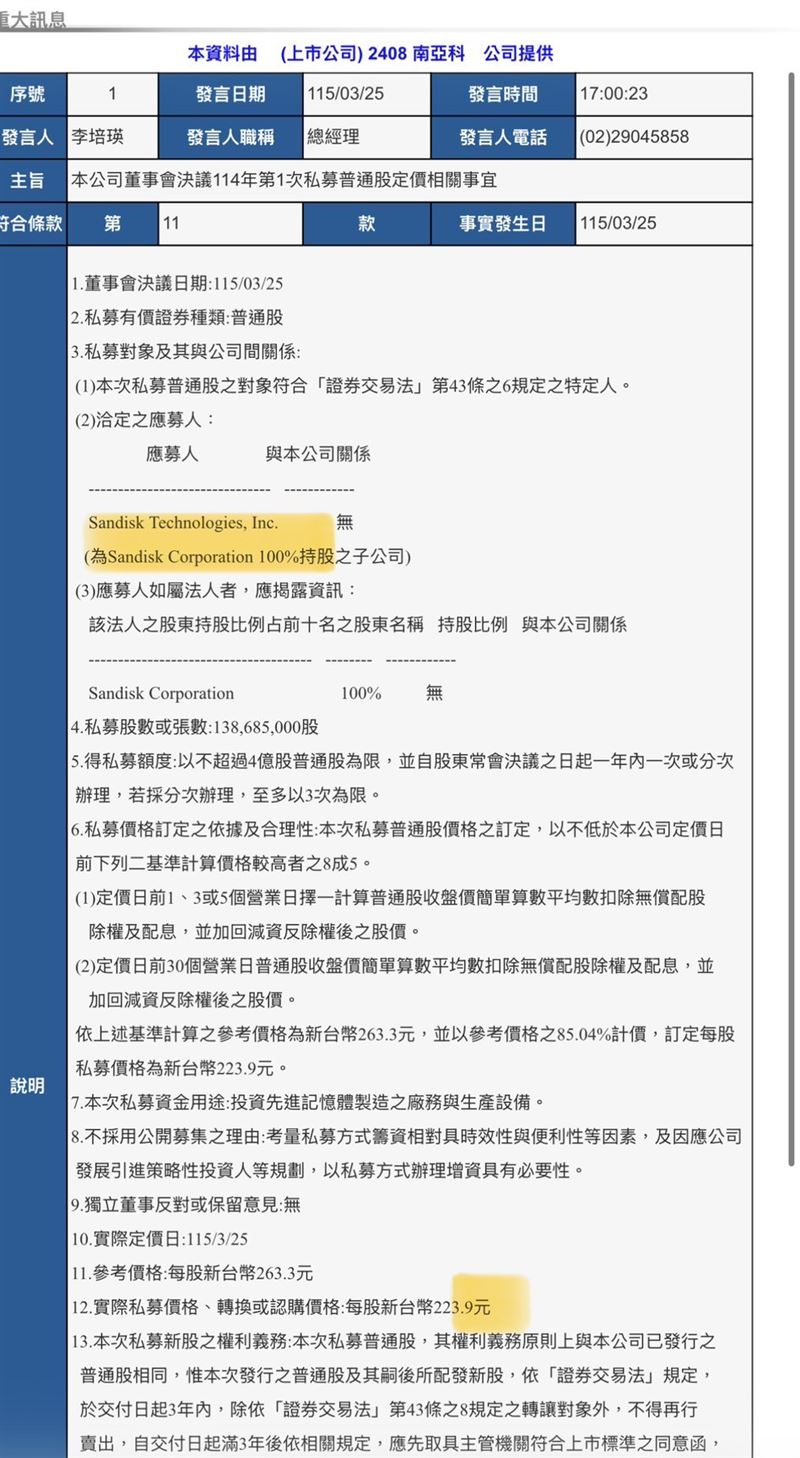 台灣新聞通訊社-快訊/南亞科私募引進SanDisk、鎧俠 分析曝光