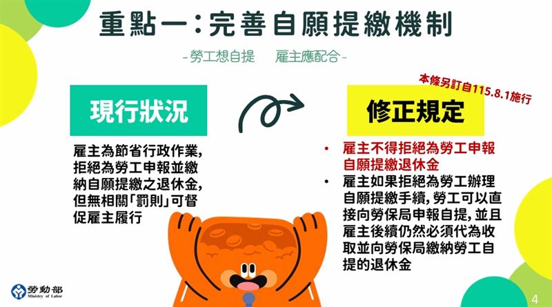 過去部分雇主為了節省行政作業,會拒絕為勞工申報並繳納「自願提繳」的退休金,但當時缺乏相關罰則 。但在這次修正後,雇主不得拒絕勞工自提要求 。若雇主不配合,勞工可直接向勞保局申報,且雇主後續仍須代為收取並繳納,否則將依規定加徵滯納金 。要注意的是,這項關乎自提機制的條文(第21條)預計自115年8月1日生效 。