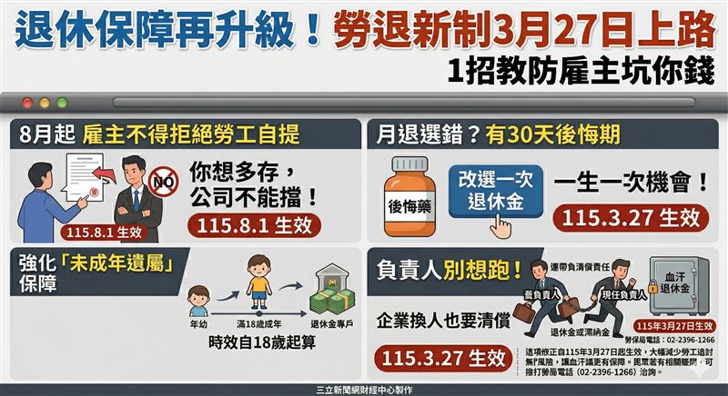 許多勞工在請領退休金時,常因為不熟悉規定而誤選了「月退休金」 。勞動部這次大開恩典,新增「猶豫期」機制,規定選擇月退休金者,在首次撥付入帳日起的30天內,有機會申請變更為一次退休金(以一次為限) 。這顆後悔藥讓勞工在資金規劃上更具彈性,此規定自115年3月27日起生效 。