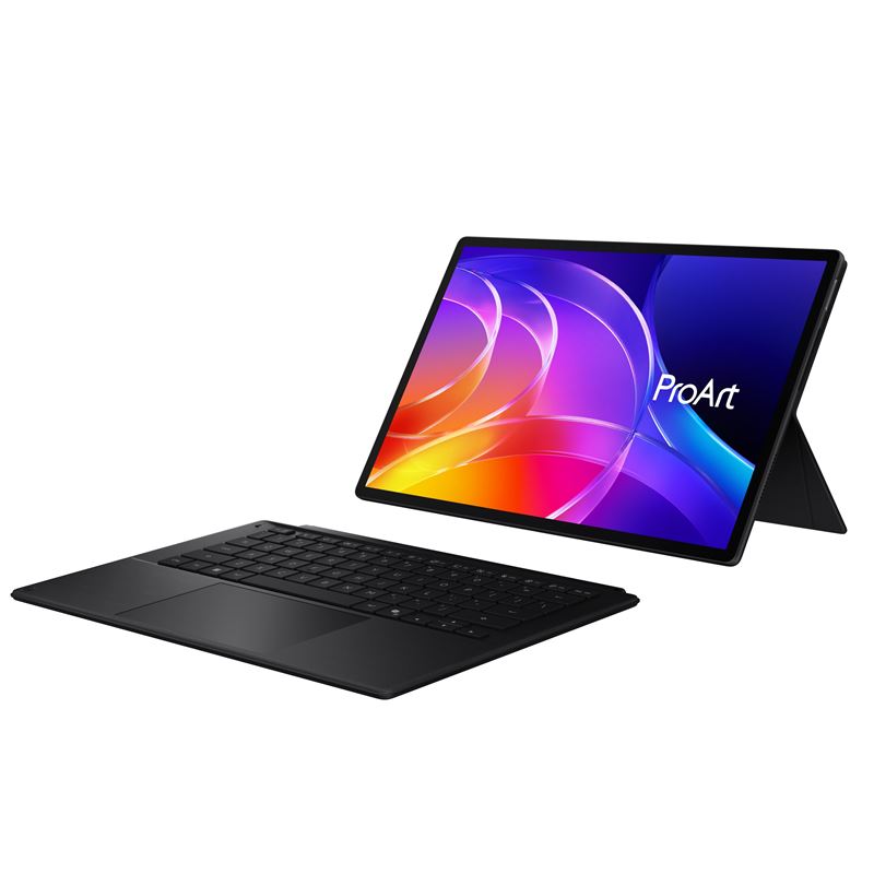 ASUS ProArt PZ14隨附可拆式藍牙鍵盤與磁吸支架,14吋144 Hz ASUS Lumina Pro OLED觸控螢幕Delta E < 1,色彩精準;抗反光塗層在室外或強光下仍能輕鬆觀看。輕0.79公斤、薄0.9公分,極輕極薄,IP52防塵防潑水,便攜可靠。搭載長效75 Wh大容量電池,不插電也可進行AI創作。預計第二季登台上市。