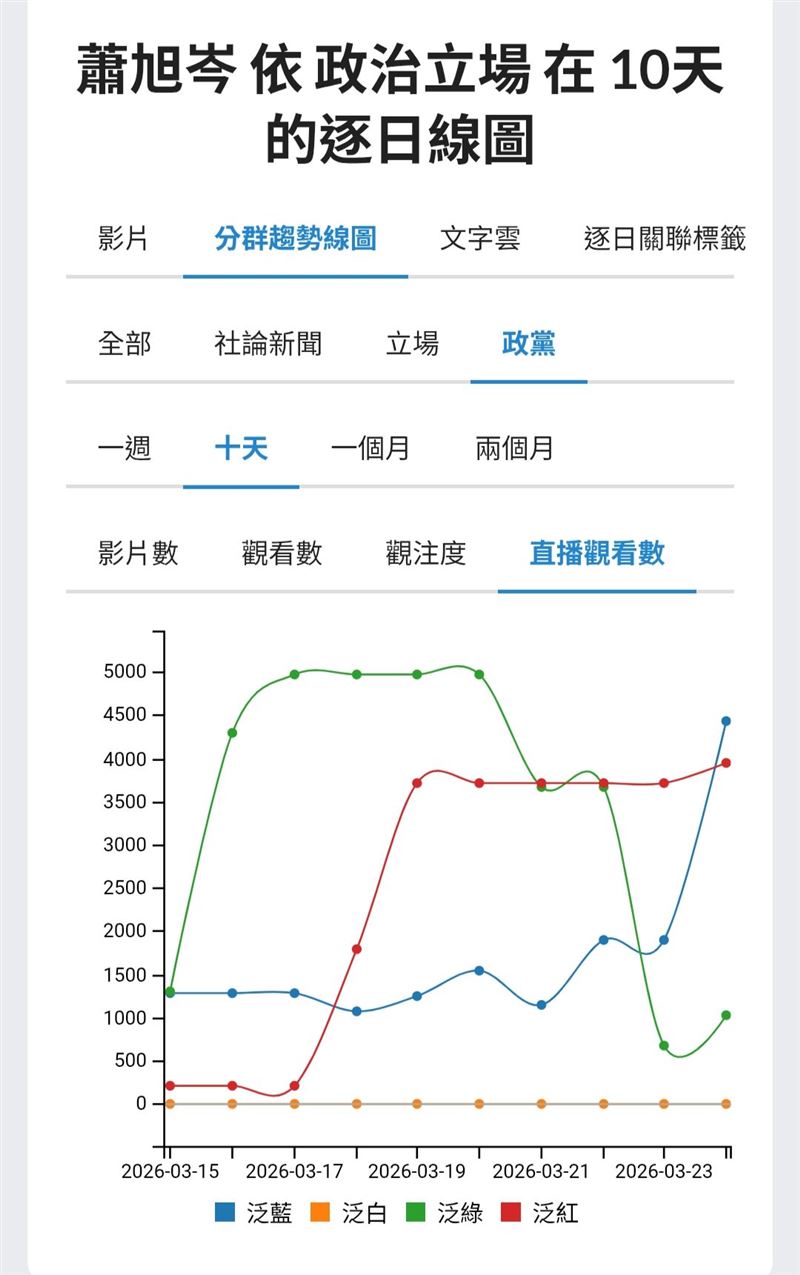 從十天的YT直播逐日線圖來看,最早快速拉高的其實是左岸(指中國)的直播聲量。代表蕭旭岑事件一開始,就很快被放進更大的中國敘事、兩岸敘事與統派政治解讀中。換句話說,這題一冒出來,就被當成有戰略價值的事件,不只是馬辦內部吵架而已。