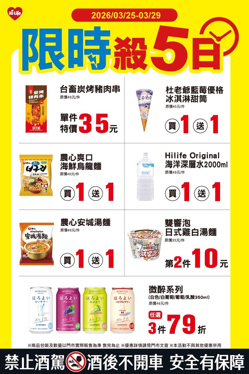 萊爾富3月25日至3月29日「限時殺5日」,杜老爺藍莓優格冰淇淋甜筒、農心爽口海鮮烏龍麵、農心安城湯麵、HiLife Original海洋深層水2000ml同品項買1送1,雙響泡日式雞白湯麵第2件10元。