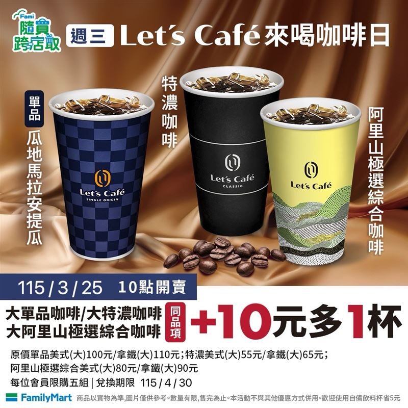 全家APP隨買跨店取3月25日上午10點起,大單品咖啡/大特濃咖啡/大阿里山極選綜合咖啡同品項第2杯10元,每會員限購5組,兌換期限至4月30日。