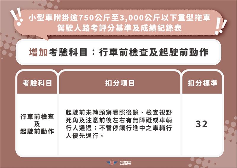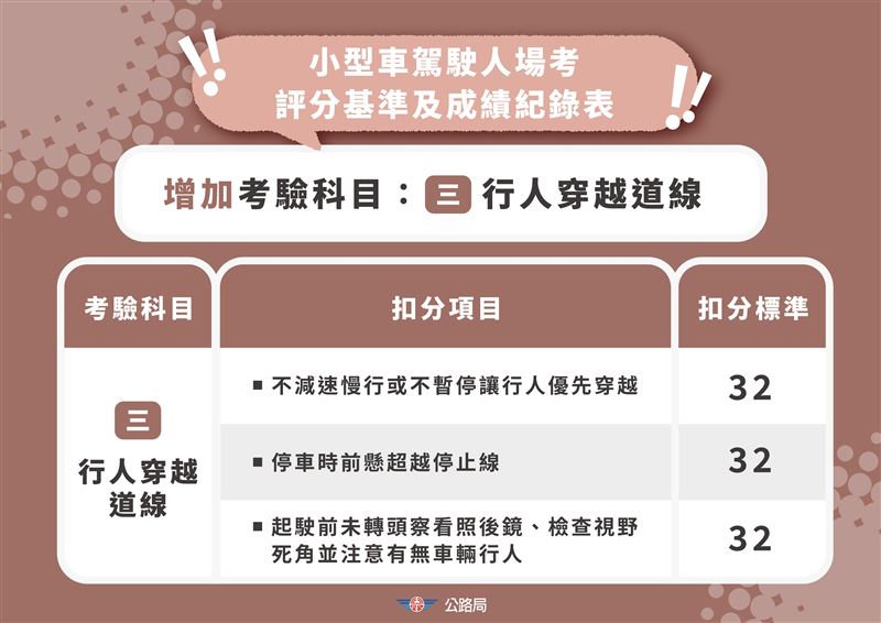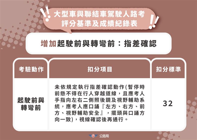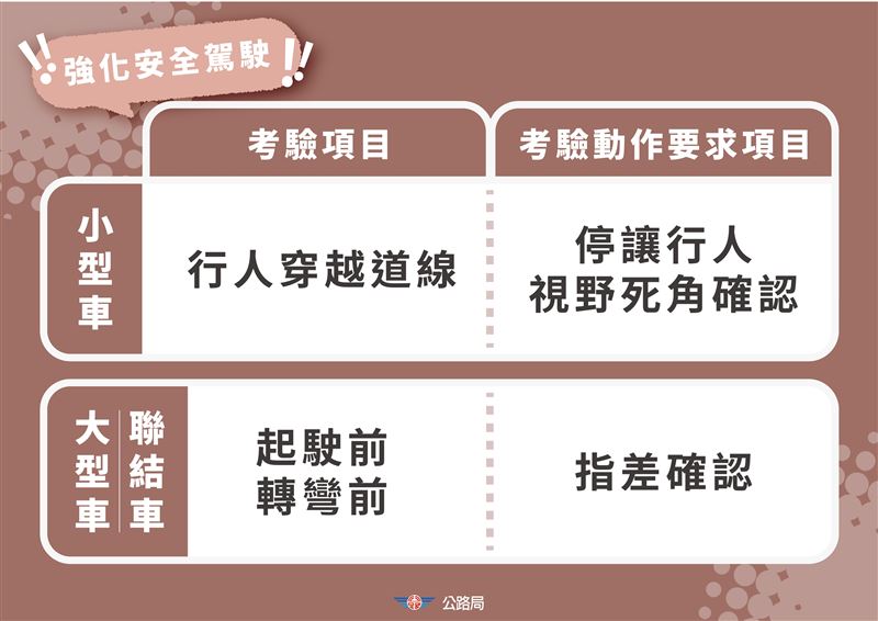 公路局局長林福山說明,本次新制核心之一為調整考照制度,從3月31日起,小型車考驗新增「停讓行人」及「視野死角確認」,行經行人穿越道未減速停讓,或起駛、轉彎前未檢視視野死角,將一次扣32分,等同直接不及格。大型車則新增「指差確認」,駕駛須於起駛與轉彎前,以手指確認左右後照鏡與前方視野,並搭配擺頭與口誦檢查,未確實執行同樣一次扣32分。