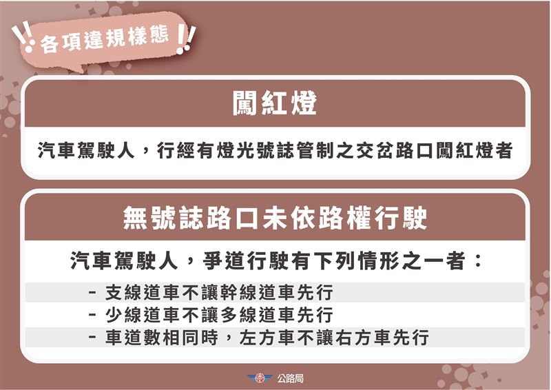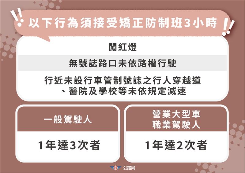 除考照制度加嚴外,針對違規駕駛也同步強化管理。林福山表示,將針對闖紅燈、未依規定減速、無號誌路口未依路權行駛等3大高風險違規,實施「矯正防制班講習」。一般駕駛人1年內累犯達3次,或營業大型車駕駛累犯達2次,即須自費參加道路交通安全講習。