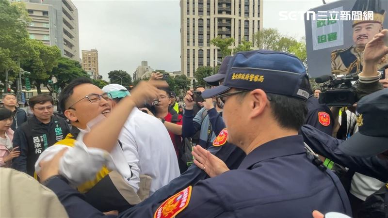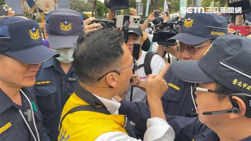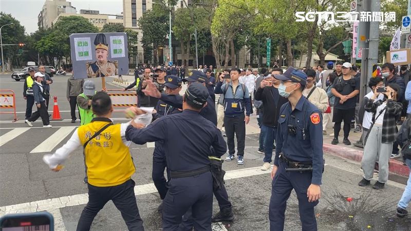 此時台北市議員候選人游智彬半路殺出,朝自己製作的人像立牌丟擲水球,現場警員立刻上前制止,與仁愛所長張寶元爆發肢體衝突,游智彬不斷質問:「你為什麼要架我拐子?我忍你很久了!」,雙方氣氛一度緊繃,其他警員趕緊打圓場,游智彬只好悻悻然退出管制區,這場鬧劇才得以落幕。