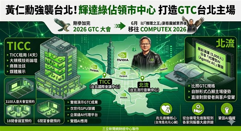 全球AI龍頭輝達(NVIDIA)執行長黃仁勳在甫落幕的2026 GTC大會上,以「推理之王」姿態震撼業界後,隨即將戰略重心移往6月登場的「台北國際電腦展(COMPUTEX 2026)」。市場盛傳,黃仁勳今年不僅要「占領台北市中心」,更規畫將台北打造成輝達的第二個GTC主場,不僅傳出包下台北國際會議中心(TICC)整棟長達4天,更計畫在展前搶下台北流行音樂中心(北流)舉辦5,000人規模的超級演講,規模之大、層級之高,均創下歷年之最。