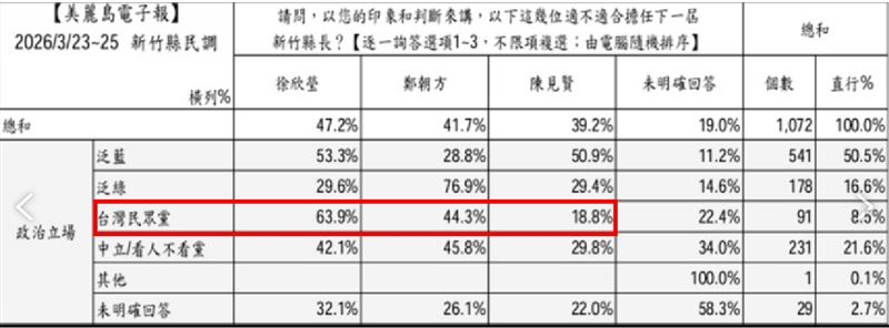 這份於 3 月 23 日至 25 日進行的調查顯示,徐欣瑩在各項指標上均展現強勢:針對「誰最適合擔任縣長」,徐欣瑩以 47.2% 奪冠,大幅領先竹北市長鄭朝方的 41.7% 與黨內對手陳見賢的 39.2%。