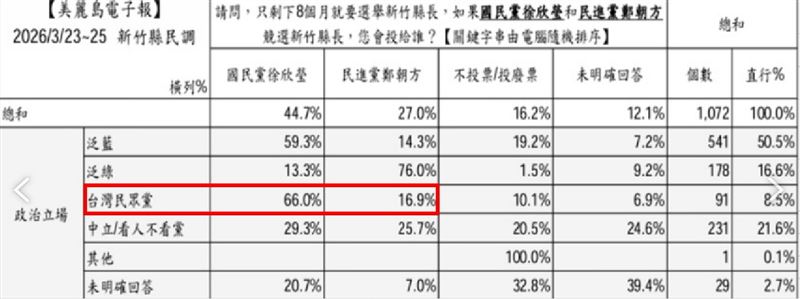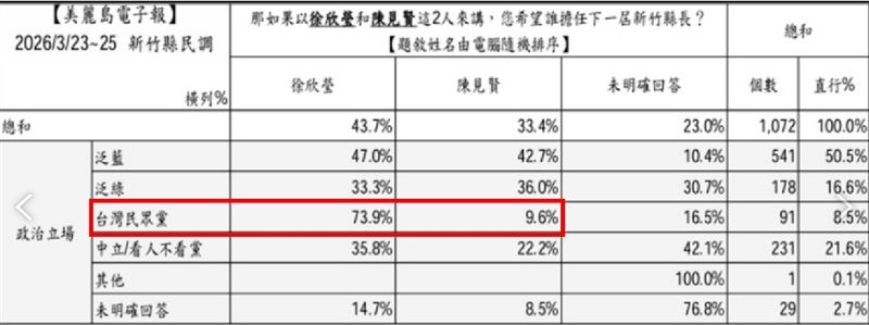 新竹縣長選戰進入白熱化,國民黨內初選爭霸戰已演變成一場攸關「藍白整合」的生存遊戲。根據《美麗島電子報》昨(26)日發布的最新民調,立委徐欣瑩不僅在藍營內部穩坐龍頭,更意外獲得民眾黨支持者(小草)的高度青睞,支持度呈現「壓倒性」優勢。地方人士分析,這份民調不僅確立了徐欣瑩的勝選方程式,也反映出對手陳見賢因「黑歷史」纏身,已逐漸失去中間選民的信任。