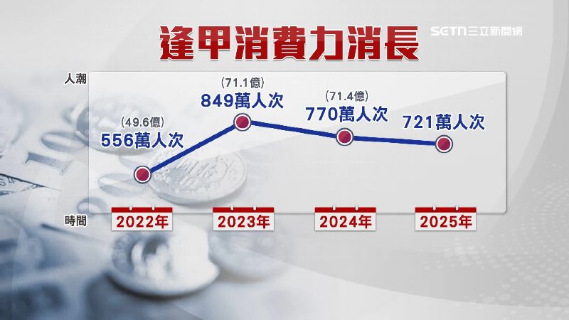 逢甲商圈的營運消長,2022年556萬人次消費力49.6億,2023年人潮增加為849萬,接著隔年開始下滑降為770萬人次,不過消費力卻成長 71.1億,2025年人數減少為721萬人次人潮等於錢潮嗎,這恐怕跟消費型態改變也大有關係。