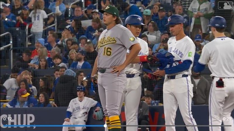 7局下岡本和真1出局站上打擊區,他在2好球沒有壞球的情況下追打1顆77英里的外角滑切球,這球不打應該是壞球,但岡本把球勾到中、左外野落地,大聯盟首安出爐。藍鳥休息區和運動家示意要回這顆球,小葛雷諾(Vladimir Guerrero Jr.)拿到後還作勢要丟上觀眾席,最後拿回休息區給大聯盟官方人員認證。