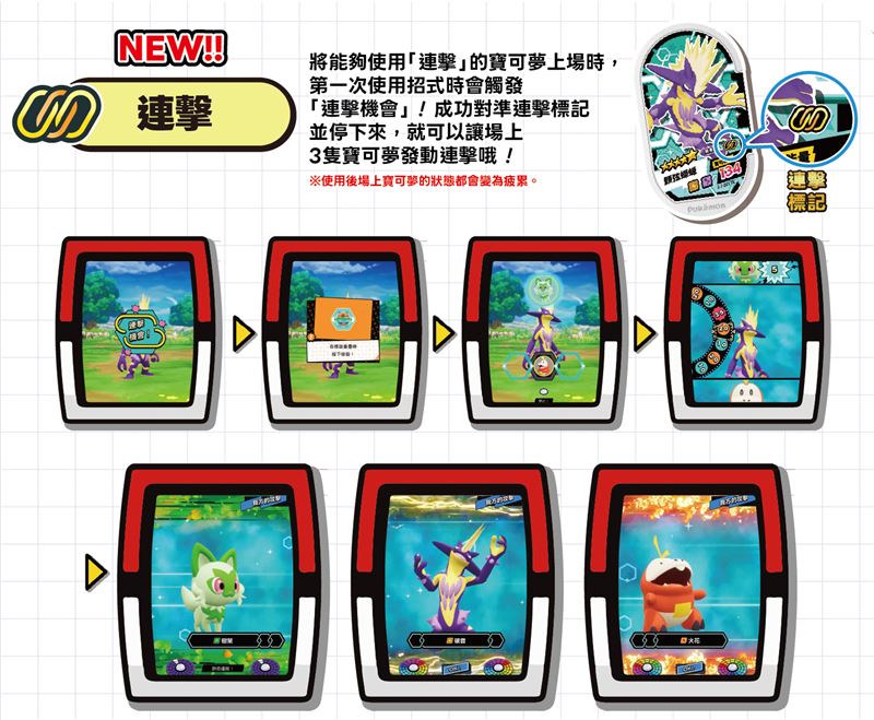 另一項新增系統「連擊」,當派出可發動連擊的寶可夢時,首次使用招式將觸發「連擊機會」。依照畫面提示成功對準並停止於連擊標記後,場上的 3 隻寶可夢將一同發動連續攻擊,對對手造成大量傷害。訓練家可依據對戰局勢靈活運用連擊,雖然發動後寶可夢將進入疲累狀態,但若能掌握最佳時機,將可大幅提升對戰優勢。