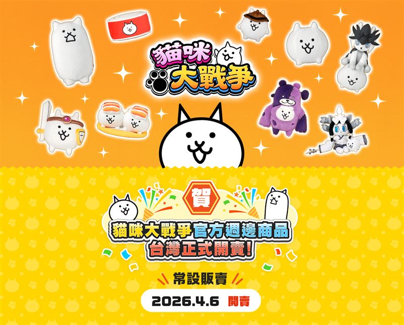 大人氣手機遊戲《貓咪大戰爭》宣布將於2026年4月6日起在台灣潮流玩具專賣店「POP TOYS 星潮玩」展開官方週邊商品常設販售。《貓咪大戰爭》是由日本PONOS株式會社發行的人氣手機遊戲,以風格獨特、趣味十足的貓咪角色深受玩家喜愛,全球累計下載量已突破1億1,000萬次。本次首度將人氣遊戲角色的日本官方週邊商品於POP TOYS常設販售,包含玩偶、生活雜貨等品項,讓粉絲可在台灣輕鬆選購兼具收藏與日常使用的豐富官方商品。首波販售將於遠百信義A13的「POP TOYS 星潮玩」登場,並預計後續拓展至全台各分店,讓更多粉絲能隨時入手喜愛角色。