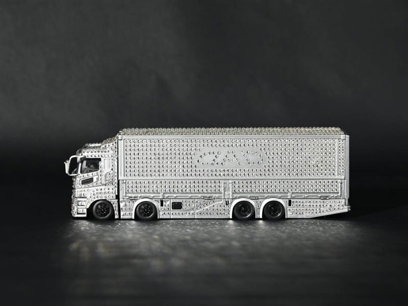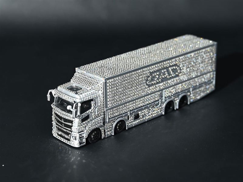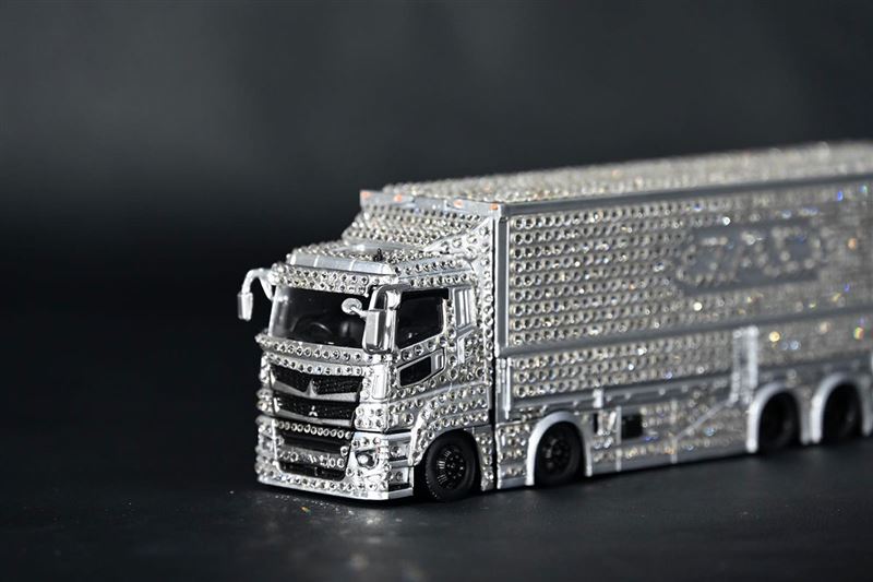 這款模型以Mitsubishi Fuso為基礎打造,最大亮點就是車身鑲嵌高達2800顆施華洛世奇認證水鑽,從車體到品牌標誌幾乎全面覆蓋,整體視覺效果極度浮誇,也讓原本低調的卡車瞬間變身精品收藏。