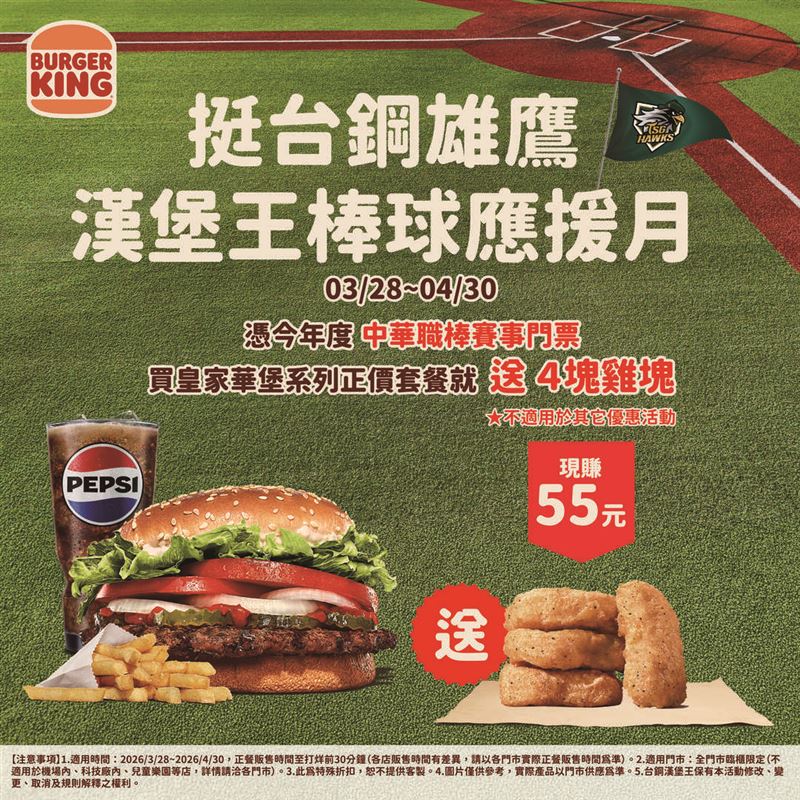 另迎接中華職棒球季開打,和台鋼雄鷹隸屬同集團的漢堡王回饋球迷,即日起至4月30日,憑中職本季門票至門市臨櫃選購華堡套餐,就送4塊雞塊。