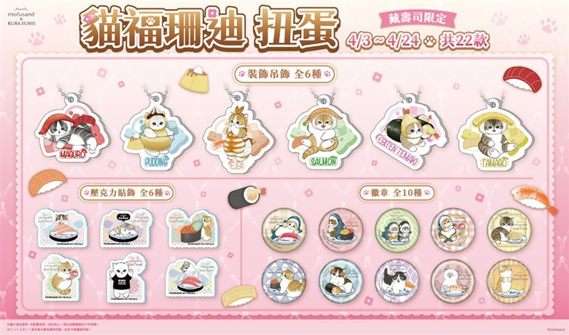 貓福珊迪魅力席捲全台!4月3日起,藏壽司將攜手日本人氣插畫「mofusand 貓福珊迪」,展開為期22天的春日療癒企劃!身為變裝達人的貓咪們這次穿上藏壽司經典品項,從人氣的「鯊魚喵」到依偎在壽司旁的「壽司喵」,共推出22款限定扭蛋,包含徽章、裝飾吊飾及結合鮮度君設計的壓克力貼飾。