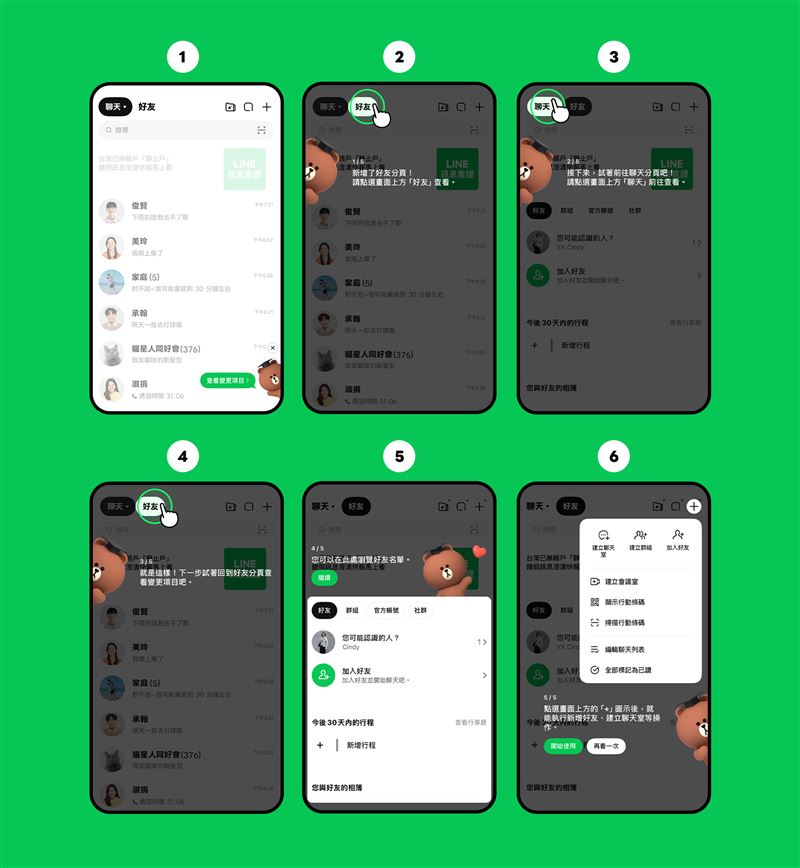 更新LINE且已經收到發布的用戶,打開LINE時將會跳出由人氣角色熊大引導的互動說明頁,逐步介紹全新的改版重點。