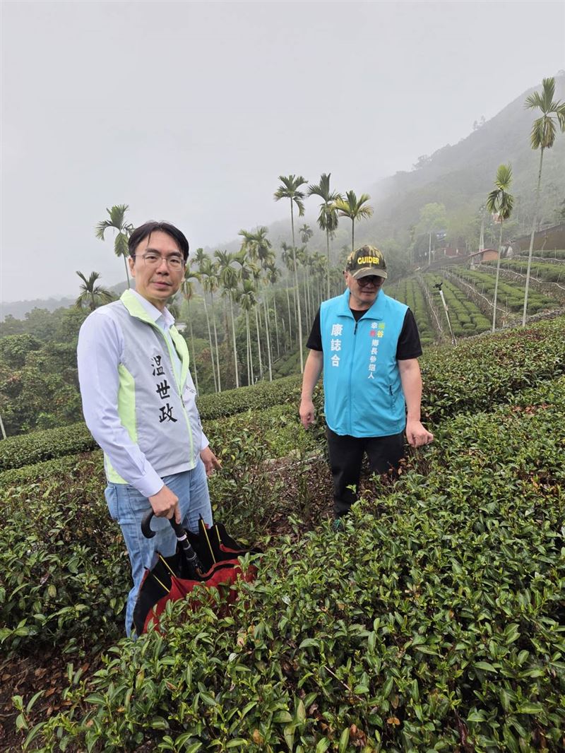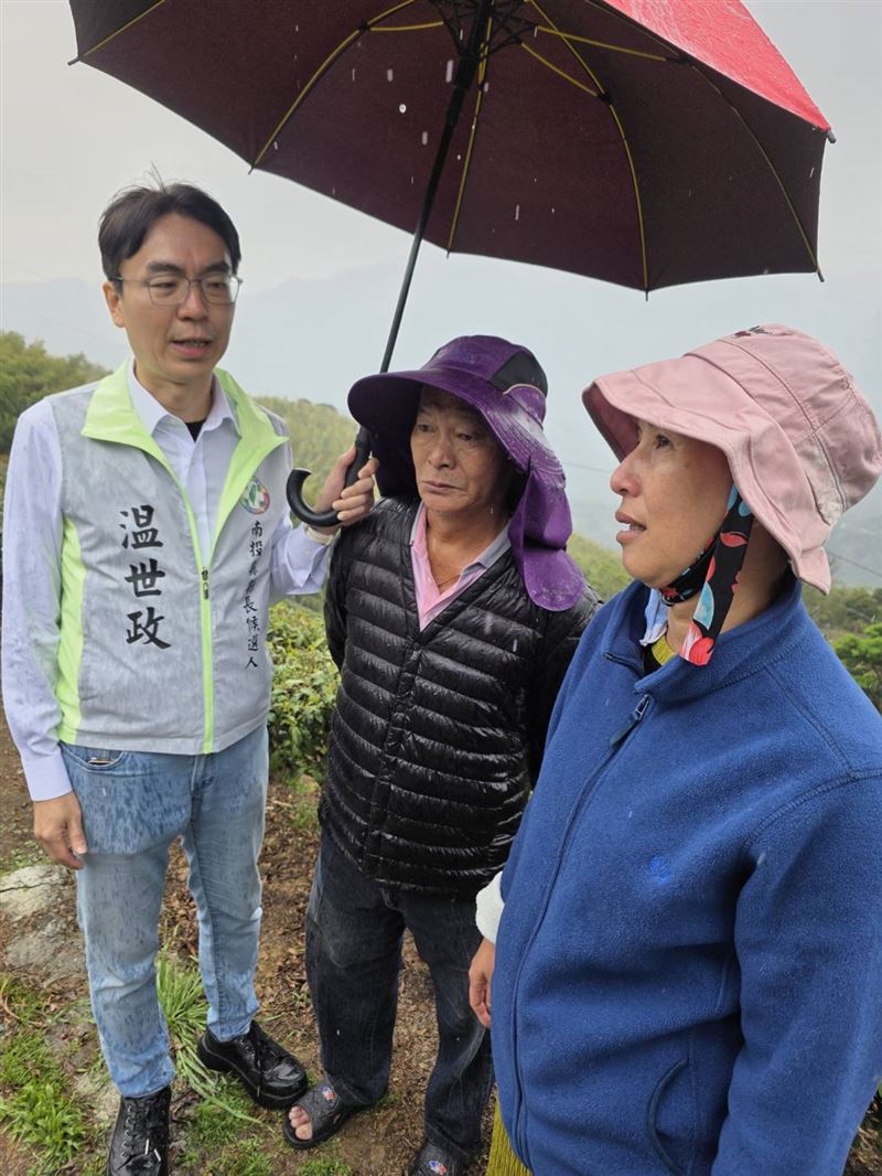 南投縣久旱導致茶樹不發芽,春茶恐減產3至5成,民進黨南投縣長參選人温世政,今會同農業部、南投縣議員陳玉鈴,以及南投縣政府等單位深入竹山、鹿谷茶區會勘農損,要爭取中央天然災害救助,縣府表示,春茶旱害恐是全縣性,將爭取農損補助納入全縣茶區,降低茶農損失。