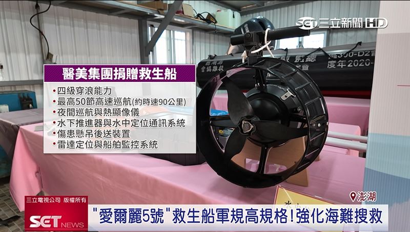 醫美集團愛心遍及台灣各地得知澎湖救生船,已經到了需要淘汰的年限就馬上訂製一台軍規高規格的救生船,不僅擁有四級穿浪能力包含水下推進器與水中定位通訊系統,傷患懸吊後送裝置功能滿滿。