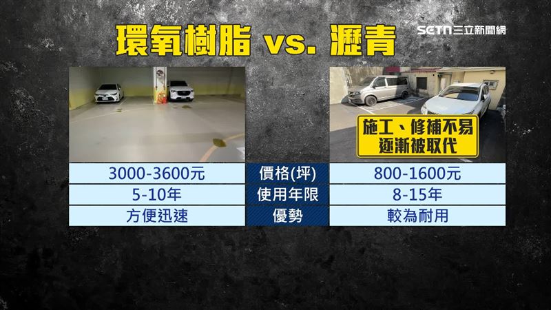 這次出問題環氧樹脂鋪面業界稱作epoxy,一坪施作價格約3000到3600元使用年限可達5到10年,由於施工方便迅速近年大為風行,相較傳統停車場使用的瀝青雖然便宜年限也比較久,但因為施工及後續修補不易逐漸遭到取代,被投訴的建商則表示龜裂是正常情形也不會影響使用,更從未承諾可以將車格刨除重做。