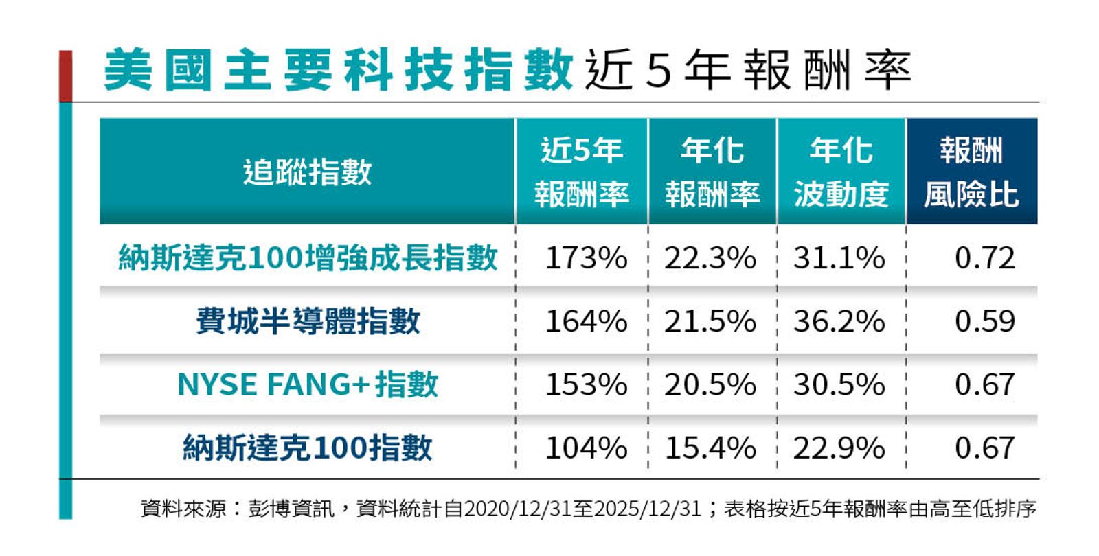 據統計,納斯達克100增強成長指數年化報酬率達18.4%,優於納斯達克100的14.9%;再觀察近5年表現,總報酬173%,甚至超越費城半導體與NYSE FANG+指數,再次印證在AI浪潮下,精選成長股能帶來更優異的表現。