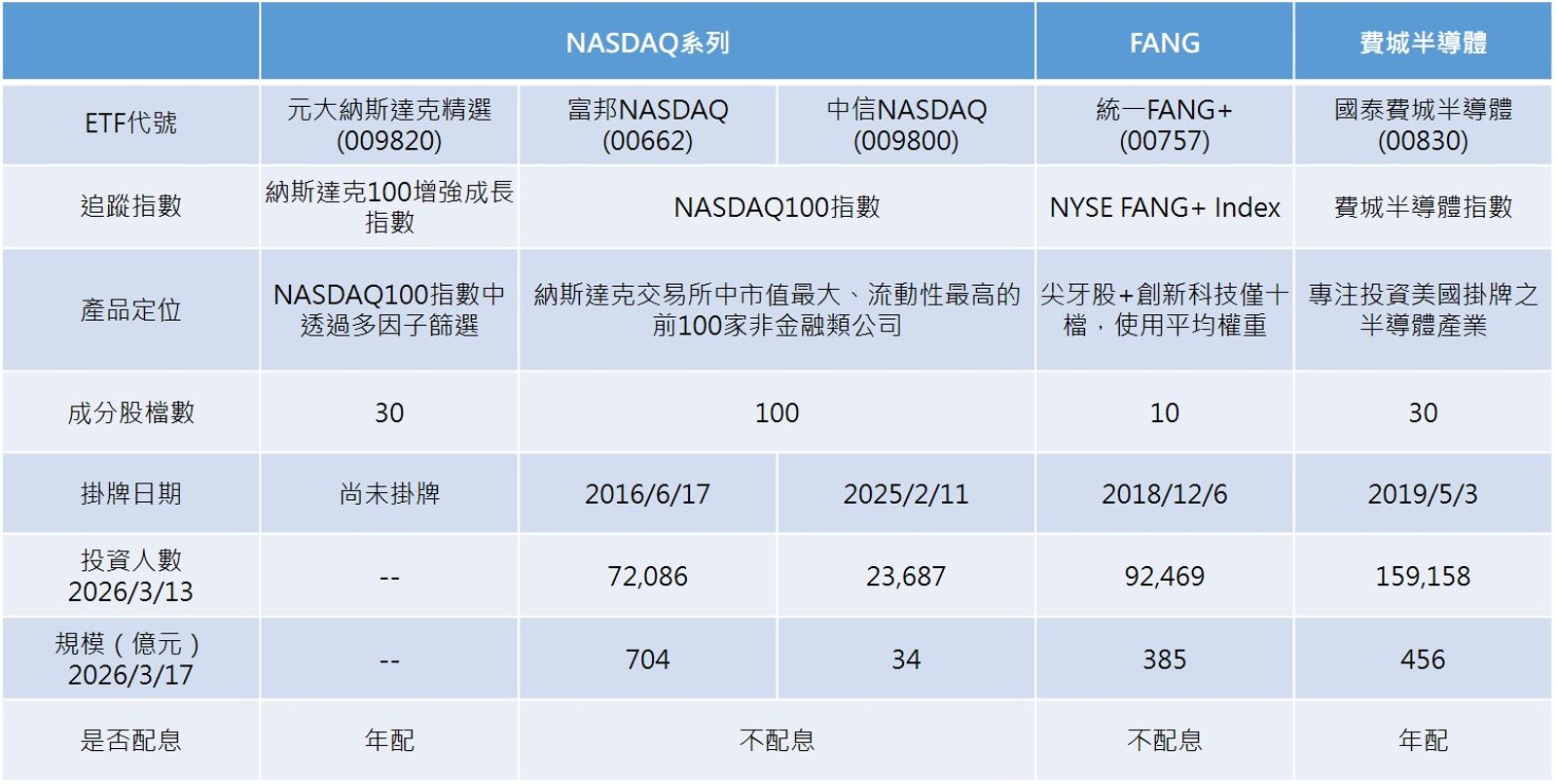 目前國內追蹤納斯達克100指數的ETF有2檔:富邦NASDAQ(00662)和中信NASDAQ(009800),另外與科技高度相關的ETF還有:統一FANG+(00757)及國泰費城半導體(00830);而即將於4月8日募集的元大納斯達克精選(009820,發行價10元),則是國內唯一追蹤納斯達克100增強成長指數的ETF。