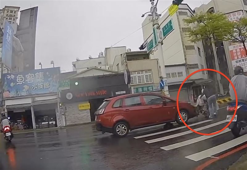 畫面中,紅色轎車趁號誌燈轉換前通過,但卻被卡在路中央,停在斑馬線前,接著行人綠燈亮起,一名推著輪椅的女子確認轎車停下後,打算快步通行,但沒想到轎車突然前進,直接撞上輪椅,輪椅被轎車「推」出斑馬線、左側「翹孤輪」,推輪椅的女子還試圖穩住,不讓最壞的情形發生。